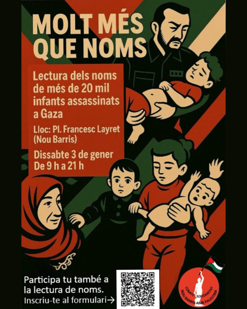El 3 de enero, la Plaça Francesc Layret de Verdum (Nou Barris, Barcelona) se convirtió en escenario de una acción de memoria y denuncia: alrededor de 150 personas leyeron, entre las 9 h y las 21 h, los nombres de 20.000 niños y niñas muertos en Gaza, una lista que no pudieron completar por su extensión, según el Comité de Solidaritat amb Palestina de Nou Barris, organizador del acto.